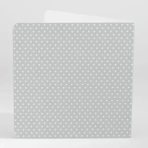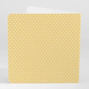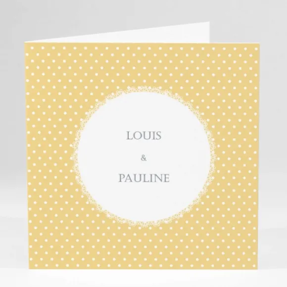 Pour annoncer à vos proches et amis votre prochain engagement, vous aimeriez un faire-part de mariage à la fois ravissant et créatif ? Ce modèle sur mesure au format livret carré se décline dans la couleur de votre choix. En couverture, sur fond coloré à pois blancs très design, un cercle bordé de petite dentelle reçoit les prénoms des futurs mariés. À l’intérieur du faire-part, votre message personnel avec la date et le lieu du mariage, accompagné des coordonnées des familles. Le carton de réception assorti à glisser dans l’enveloppe complète joliment le faire-part. Sur simple demande, nous pouvons également créer vos livrets de messe, menus et cartes de remerciement.