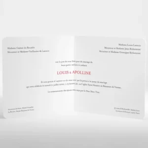 Disponible en deux couleurs principales, rouge ou bleu, le faire part de mariage Tourbillon peut être personnaliser grâce à notre logiciel en ligne prévu à cet effet et qui vous permet de modifier le texte et les couleurs. Lorsque votre création est validée, une graphiste se charge des dernières vérifications afin de vous offrir un résultat professionnel. En cas de crainte ou de doute, vous disposez de l’option d’impression d’un échantillon papier, une solution efficace qui vous permet d’examiner par vous-même le rendu réel de votre carte mariage.