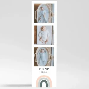 Faire-part Elégant vous présente son modèle « Arc en Ciel ». Il s’agit d’un faire part de naissance imprimé sur un papier magnet. Grâce au papier magnet, gardez le faire part de naissance de votre bébé toujours à portée de vue. Notre modèle Arc en ciel est prévu pour accueillir jusqu’à 3 photos de votre enfant le tout réunis sur une mise en page à l’esprit photomaton. Vos proches seront charmés par le format marque page magnet original de ce faire part de naissance.