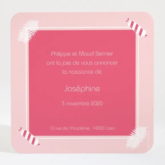 Des illustrations délicates pour présenter votre bébé. Adapté pour mettre en valeur le texte et la photo de votre faire part naissance grâce à de belles illustrations. Notre faire part naissance propose de délicats dessins crayonnés de feuilles et de bonbons afin de laisser place à la photo de votre petite fille ou de votre petit garçon ainsi qu’à votre texte de présentation. Les deux cadres, délicatement soulignés d’un liseré fin, vous permettront de composer comme bon vous semble un faire part naissance unique pour votre bébé.
