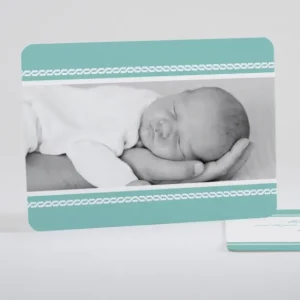 Votre enfant est arrivé ou sur le point de naître et vous recherchez un faire part de naissance chic et tendance ? Déclinable dans la couleur de votre choix, ce modèle au format carte postale est à la fois simple et élégant. D’un côté, une jolie photo de votre bébé est encadrée par deux frises, en haut et en bas, représentant une fine chaîne dans une bande de couleur. À l’arrière, le même design est repris pour afficher votre texte personnel. Ce faire part de naissance convient parfaitement pour les petites filles et pour les petits garçons. Nous aimons l’effet de contraste créé en choisissant une photo en noir et blanc.