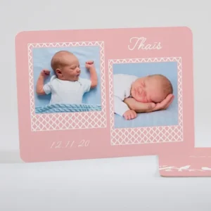 Vous êtes à la recherche d’un faire part de naissance chic et original pour annoncer à vos proches l’agrandissement de votre famille ? Sur fond sobre ou coloré, ce faire part au format carte postale fait le pari de la créativité et se décline selon vos envies. Au recto, deux illustrations rappelant les photos Polaroid viennent accueillir les clichés de votre bébé. Ce modèle convient ainsi également pour les naissances de jumeaux. Au verso, votre texte personnel est orné d’un dessin représentant deux oiseaux sur une branche. Entièrement personnalisable, ce faire part est idéal pour les petites filles et pour les petits garçons.
