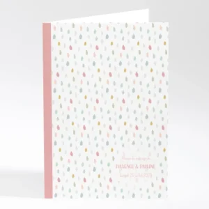 Laissez-vous charmer par ce livret de messe de mariage frais et créatif qui apportera joie et couleur dans votre église. Vos proches apprécieront de pouvoir suivre toute la cérémonie avec ces beaux livrets de messe mariage qui deviendront assurément un beau souvenir de cette journée. Telle une pluie d’allégresse, de douces gouttes de couleur parent la couverture de votre livret. Dans un coin, un cercle blanc reçoit vos prénoms accompagnés de la date de votre mariage. Entièrement personnalisables, choisissez la couleur principale de vos livrets de messe qui s’adapteront facilement au thème que vous aurez choisi pour votre mariage.