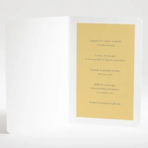 Retrouvez le menu de mariage « Feuillage Chic » décliné du faire-part mariage champêtre de la même collection ! La pétillante Trendy Fabrik nous propose ici un modèle de menu décliné en quatre couleurs naturelles, qui ira parfaitement avec votre thème de fête. Au recto de ce menu format livret portrait, vous trouverez une large illustration de feuillages, qui lui confère une allure très chic. Au verso, vos invités découvriront le repas de la soirée avec appétit, que vous aurez pris soin de personnaliser avec la typographie de votre choix. Envie d’une carterie mariage en harmonie ? Optez pour le livret de messe de cette collection !