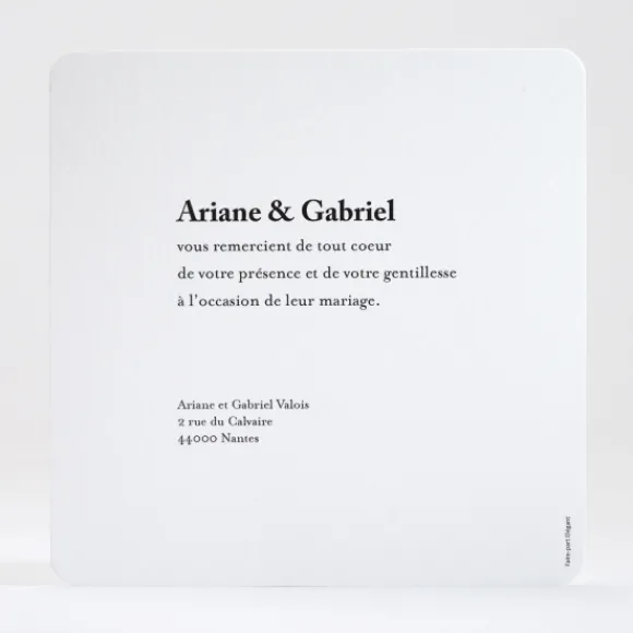 Faire-part Elégant est fier de vous présenter ce modèle Letter. Une graphiste vous est dédiée pour la création de votre Remerciements mariage