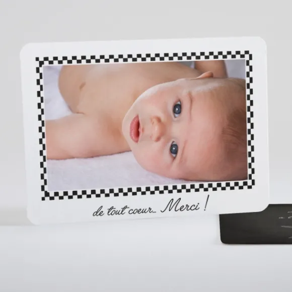 Avec un parti pris graphique résolument tendance notre étincelante designer, The Modern Corner, vous propose cette carte remerciements de naissance intitulée « Damier ardoise ». Chez Faire-part Elégant, nous aimons cet aspect ardoise qui en fait une carte remerciement naissance originale. Comme pour toutes vos commandes, notre attention se portera avant tout sur le choix d’un papier de qualité autant pour vos cartes que pour les enveloppes de couleur qui les accompagneront. Ces cartes de remerciement naissance sont au format carte postale recto-verso ce qui vous permet de choisir une large photo de votre bébé. Cela ne manquera pas d’attendrir vos proches tout en vous donnant l’occasion de leur dire merci. Envoyer vos remerciements naissance devient un jeu d’enfant.